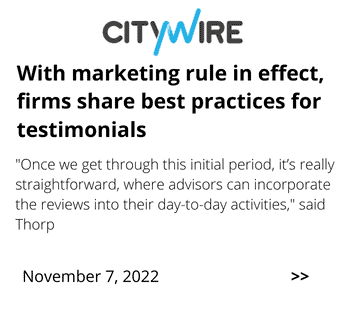 A news headline reads: "NASAA moves to let state RIAs use client testimonials, aligning with SEC rule," with a quote about states modernizing rules for financial advisors. Dated July 30, 2025, from InvestmentNews.
