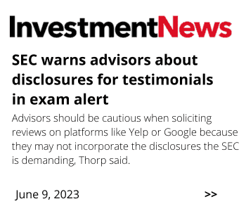 Compliant Testimonial Marketing: Our review platform designed for SEC/FINRA compliance helps advisors collect, display, and promote client testimonials confidently, accelerating trust and significantly improving conversion rates compared to advisors without reviews.